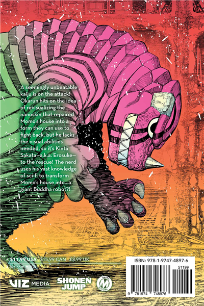 A seemingly unbeatable kaiju is on the attack! Okarun hits on the idea of revisualizing the nanoskin that repaired Momo’s house into a form they can use to fight back, but he lacks the imagination needed, so it’s Kinta Sakata—a.k.a. Erosuke—to the rescue! The nerd uses his vast knowledge of sci-fi to transform Momo’s house into…a giant Buddha robot?!