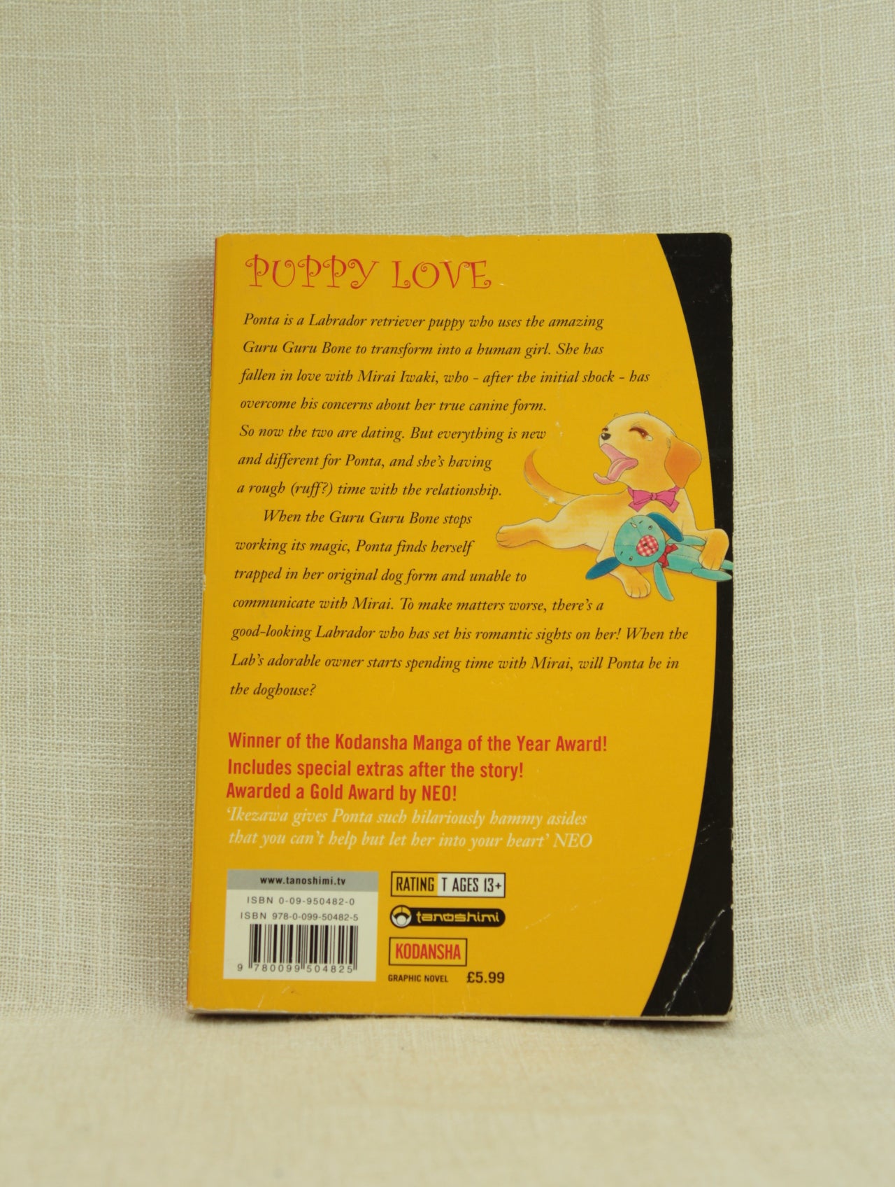 Ponta is a Labrador retriever puppy who uses the amazing Guru Guru Bone to transform into a human girl. She has fallen in love with Mirai Iwaki, who–after the initial shock–has overcome his concerns about her true canine form. So now the two are dating. But everything is new and different for Ponta, and she’s having a rough (ruff?) time with the relationship.