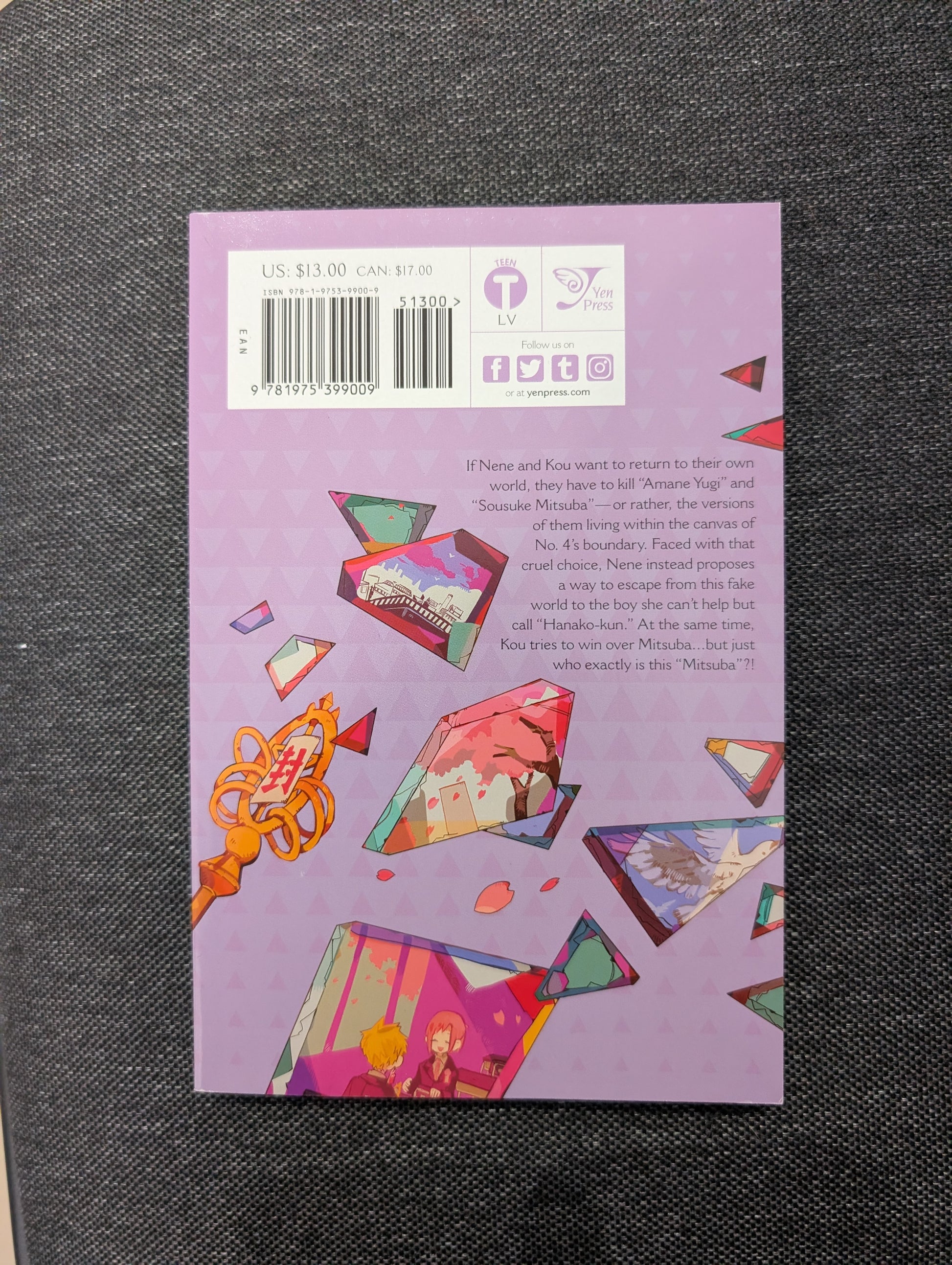 If Nene and Kou want to return to their own world, they have to kill “Amane Yugi” and “Sousuke Mitsuba”- or rather, the versions of them living within the canvas of No. 4’s boundary. Faced with that cruel choice, Nene instead proposes a way to escape from this fake world to the boy she can’t help but call “Hanako-kun.” At the same time, Kou tries to win over Mitsuba...but just who exactly is this “Mitsuba”?!